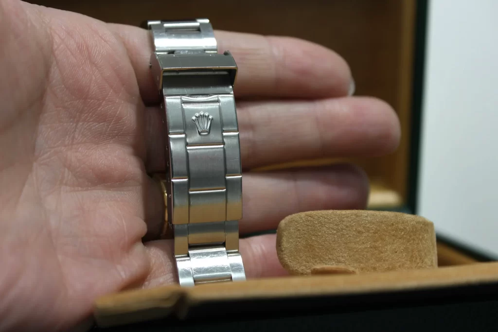ベルトは全てヘアライン仕上げ。バックルはベルトのコマの型押しがされ、まるでワンピースデザインのような佇まいです。一体感を求めたロレックスらしいデザインですね。